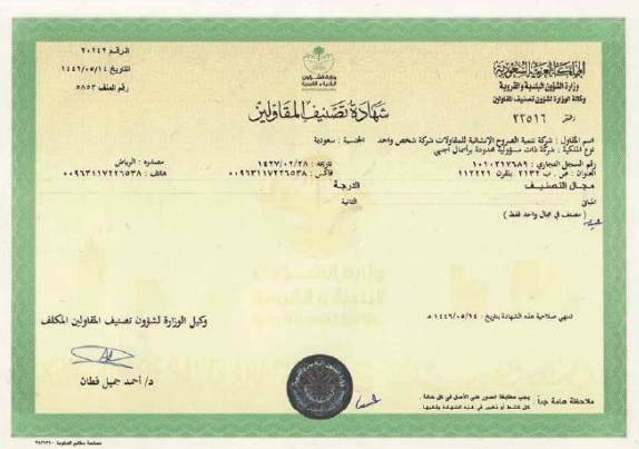 سجلت في هيئة المقاولين السعودية برقم 10002736، مع خبرة في مشاريع تصل إلى عشرات الآلاف من الأمتار المربعة.