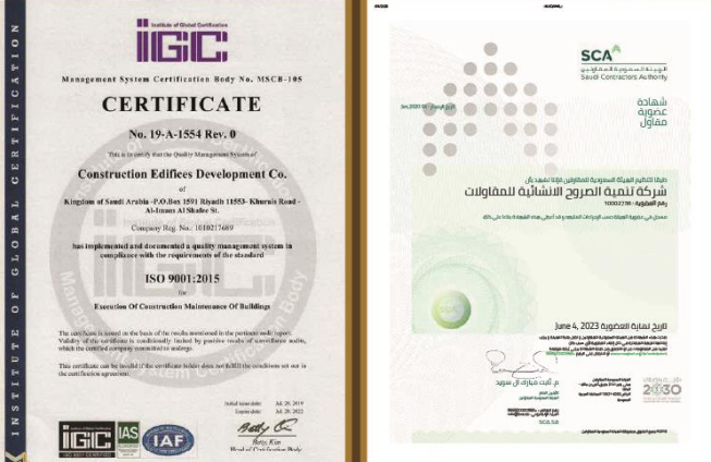 حصلت على شهادة ISO 9001:2015 من معهد الشهادة العالمي لنظام إدارة الجودة في تنفيذ الإنشاءات وصيانتها.