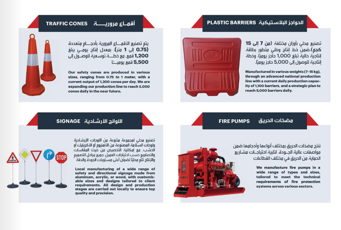 بيع أدوات ومعدات السلامة والوقاية الشخصية، ومستلزمات السلامة المرورية واللوحات والعواكس والأنظمة المرتبطة بتنظيم حركة المرور.