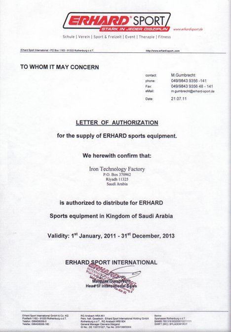 ويعتبر المصنع الوكيل الرسمى فى المملكه العربيه السعوديه لتوريد الاجهزة الرياضيه من شركة ايرهارد الالمانيه.